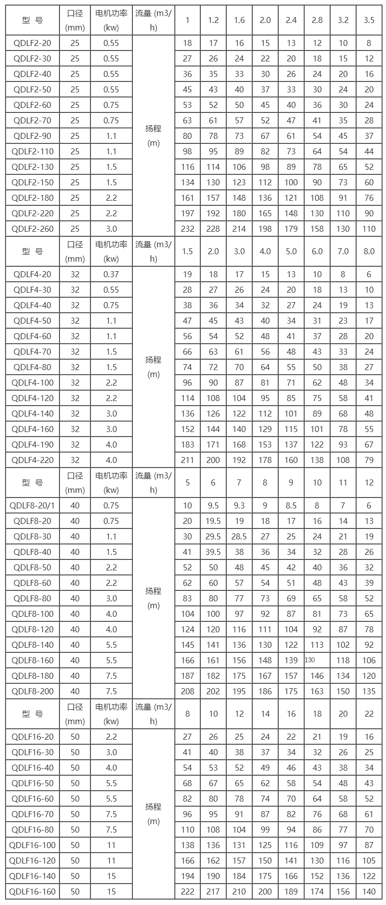全系列分為8種規格。QDLF立式多級不銹鋼離心泵是泵運轉平穩.低噪音,整機質量可靠,外形美觀,體積小,重量輕,運行安裝方便,是理想的綠色,環保,節能水泵. 流量2-80m3/h,出口壓力最大2.4Mpa,溫度-20℃~150℃