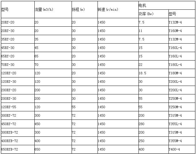 二、特點 使用溫度(T):-20℃~+450℃ 流量(Q): 3~600m3/h 揚程(H): 10~72m 三、性能范圍: 100RY-37B 100:流量 R:高溫 Y:立式泵 37:揚程 B:材料代號